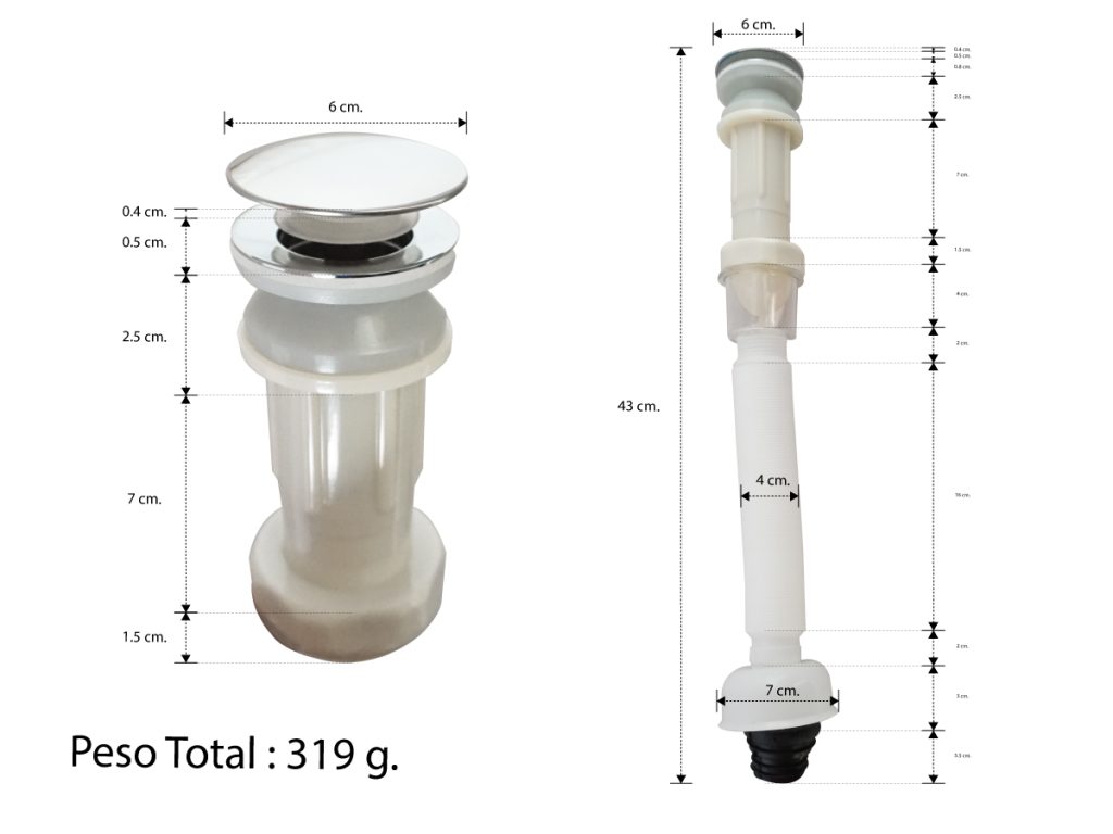 MODELO: BLL-766 CARACTERÍSTICAS Cespol de tapa grande. Cierre de push. Cespol de plástico. Trampa anti-olores. Versátil y elástico ideal para ajustarse a la salida al drenaje. ESPECIFICACIONES Material: Acero inoxidable y PVC. Tapa: Cromada.